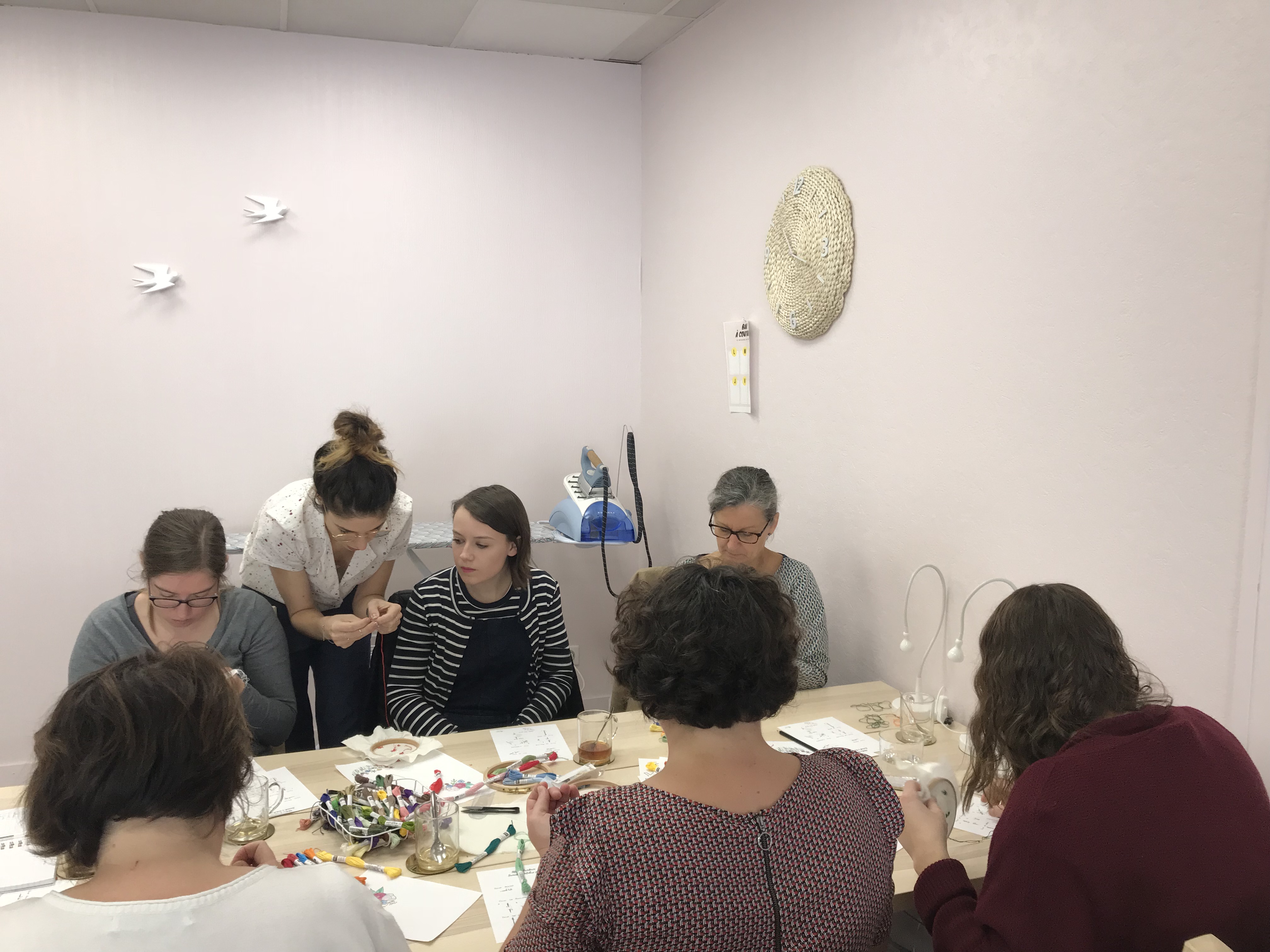 Dans une ambiance très cosy et sympa, Véronique, Aurélie, Anaïs, Julianne, Bertille et Karine ont fait, durant deux heures et demies, leurs premiers pas de brodeuses :